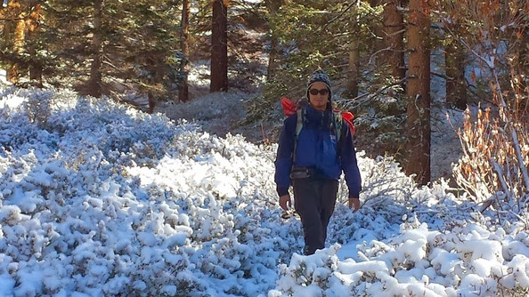 This winter I tried my luck on San Gorgonio with my friend Colin. We've camped together a few times and we both found that we had some free time in San Diego this December. I've been up to the peak a few times in the summer, but it's snowy and cold enough that the mountain isn't as popular in the winter. The temperature was also predicted to drop into the single digits at night. After stopping by the ranger station, we found we were one of two parties on the mountain that week. Lucky for us, the other party had gone up a day or two before and we used their footprints to follow the trail up the mountain switchbacks. Also lucky for us, there had been recent snowfall, but nothing like the storm I had seen in 2004, so the snow had actually melted on a lot of the sun-facing slopes.